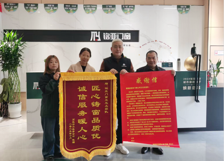 次日,客户满怀感激之情,送来了锦旗和感谢信,表达了深深的谢意,称铭亚门窗为他们解决了急难盼愁问题,“匠心铸窗品质优,诚信服务暖人心”,换门窗,还是得找靠谱有责任心的商家。