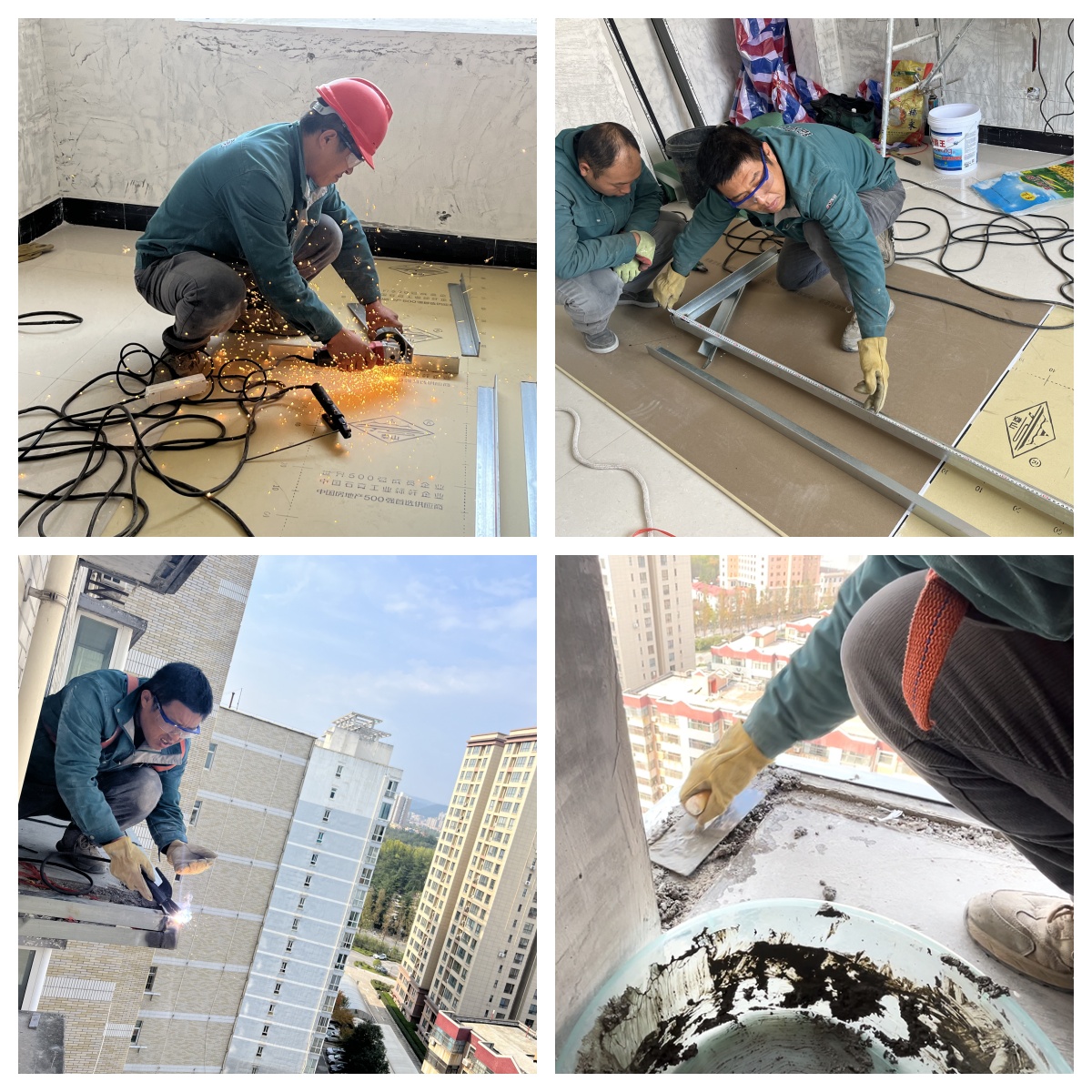 几日后,修复飘窗所需材料备好,安装人员达到现场,按照既定的修复方案,使用钢板悍成框架,固定牢固原受损窗台,并进行水泥砂浆填充,从框架到细节全面加固,杜绝后患,顺利完成了窗户安装,让客户住得更踏实。