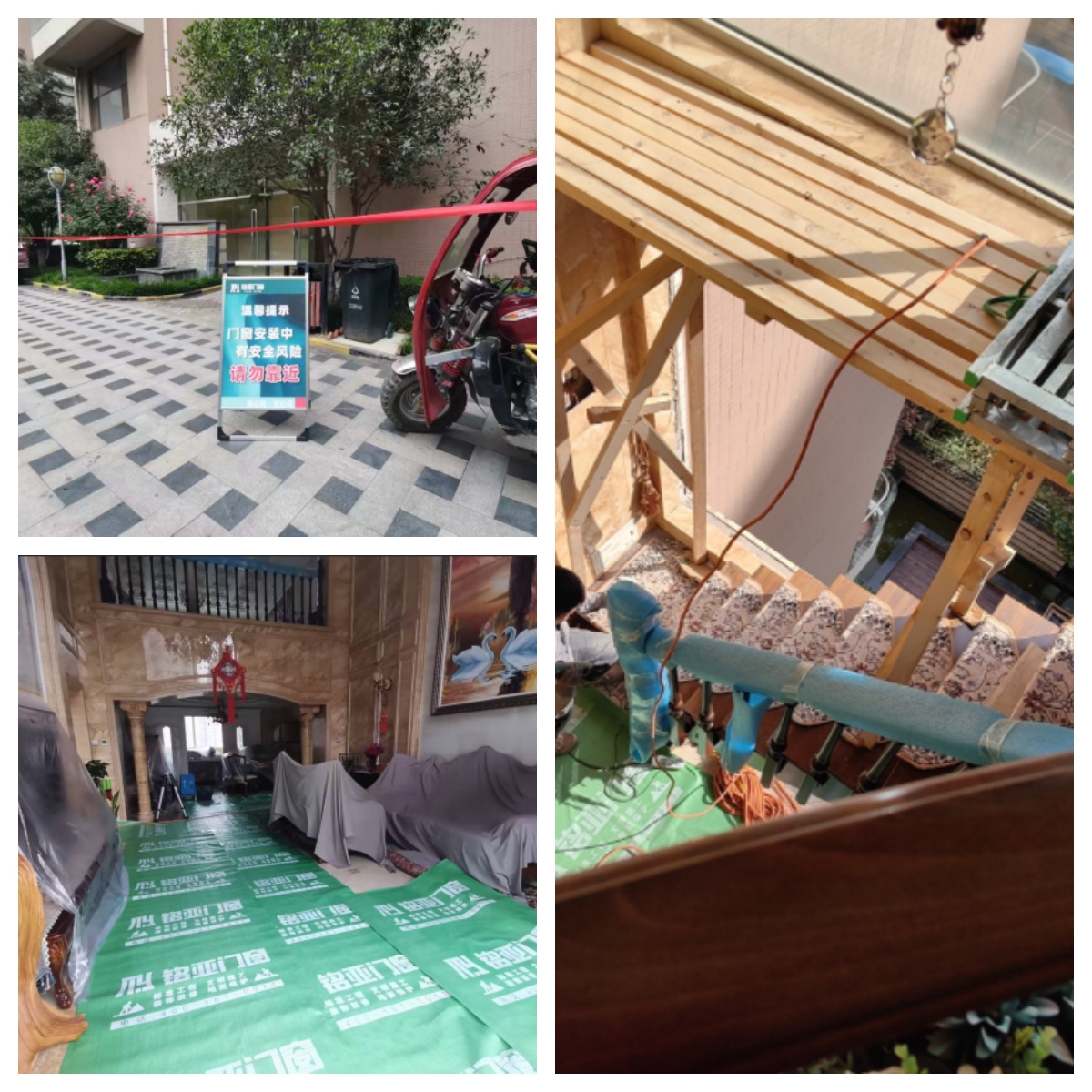 拆除、吊装、安装全过程严格安装《铭亚门窗吊装规范》、《精装房现场保护规范》、《安装作业指导规范》执行,王总亲临现场,指导督查,楼下安全警示牌、警戒线、室内全方位防护、依据现场实际情况楼梯间大玻璃拆装有难度,专门购买木料制作异形木梯等等……所有的精心准备都是为了保证安装质量,为了给客户交付放心好门窗。