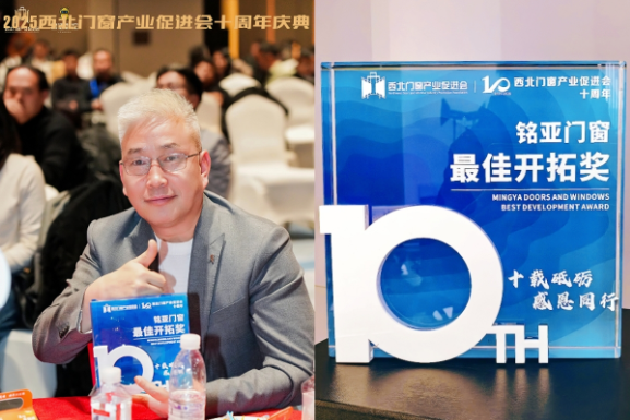 2025年12月21日,西北门窗产业促进会十周年庆典在西咸新区隆重召开,铭亚门窗参会并凭借在技术创新、市场拓展与商业模式探索等方面的卓越表现,荣获“最佳开拓奖” 殊荣。